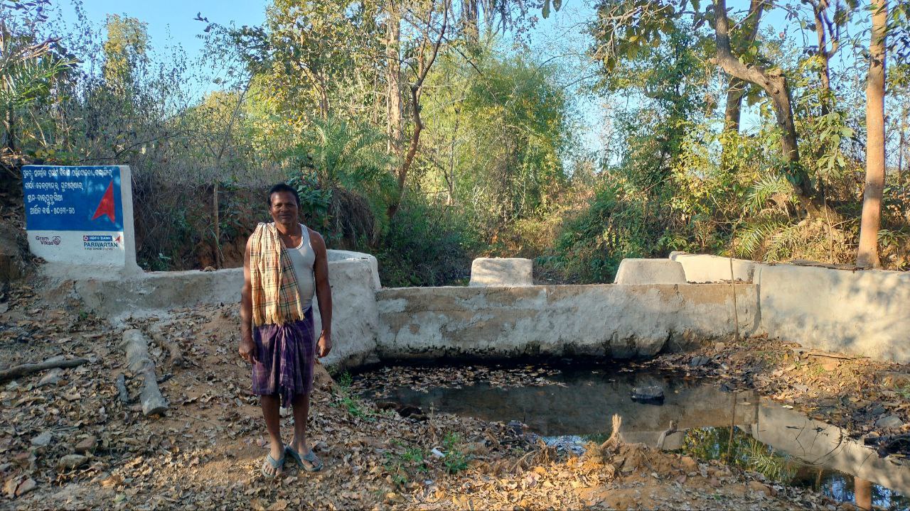 Chaitanya Sa, a farmer from Barapudugia village, stands in front of the community-built check dam that now ensures water security for local farmers, even during erratic monsoons.
